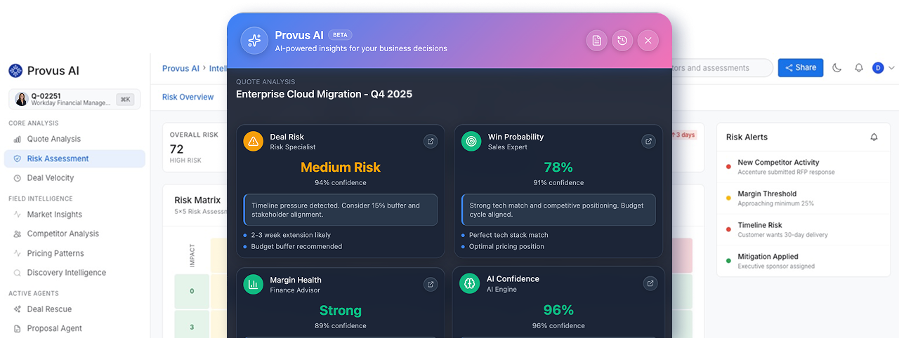 Provus AI is the only services quoting platform powered by agentic AI. Turn ideas into quotes while AI agents monitor deals, optimize pricing, and rescue at-risk opportunities—automatically.