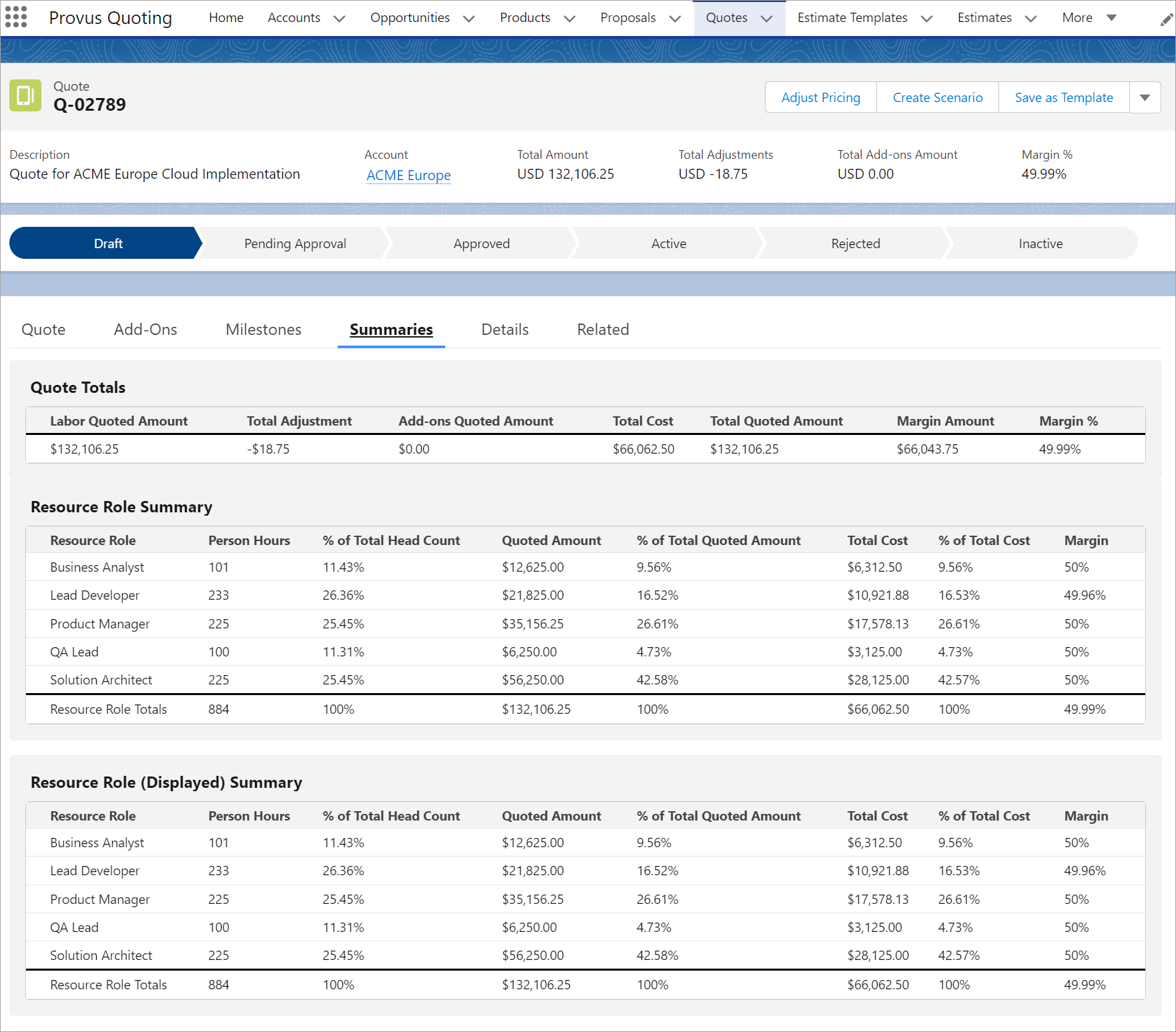 While negotiating bigger deals, there is a level of tension among internal stakeholders including Sales, Delivery, and Finance to meet customers’ expected budget, maintain margins, and maximize revenue, while keeping delivery risk low. To optimize these aspects while negotiating deals, Provus pricing solution provides “What-If” scenario capability, where you can easily create multiple what-if scenarios with different pricing strategies, compare them side-by-side to make decisions, and even submit multiple of these for approval. The approved scenario will become the primary quote.