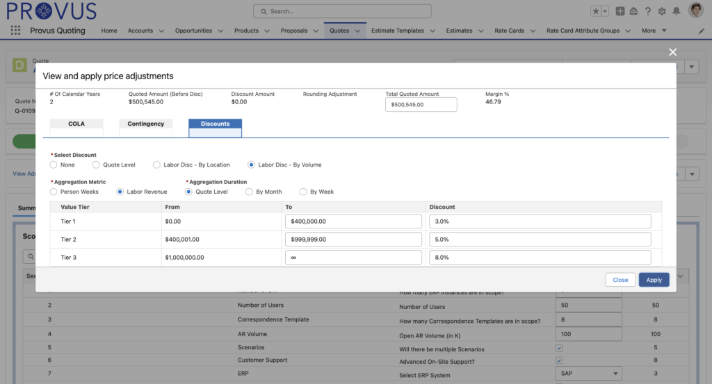 Quickly create services quotes that meet customer needs and comply with corporate policy. Guide sales reps through the project scoping and planning phase to ensure they understand the margins and hit the right service factors.