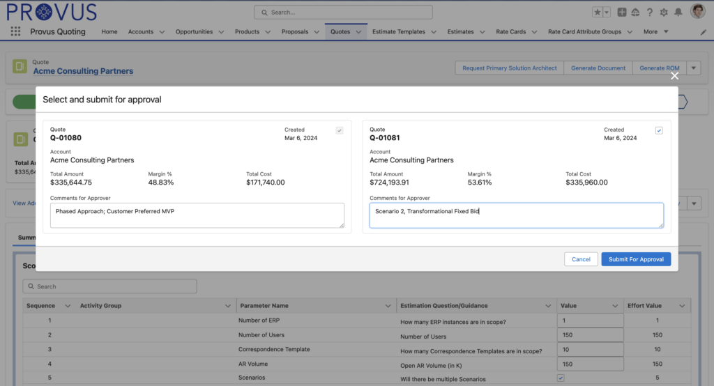 - Track internal approvals and customer-presented scenarios
